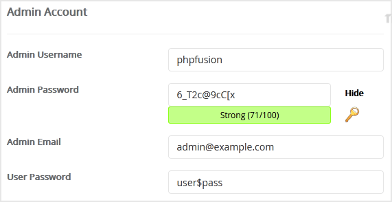 • Admin Username: Your new PHP-Fusion username (for security reasons, do not use the administrator or the admin username).